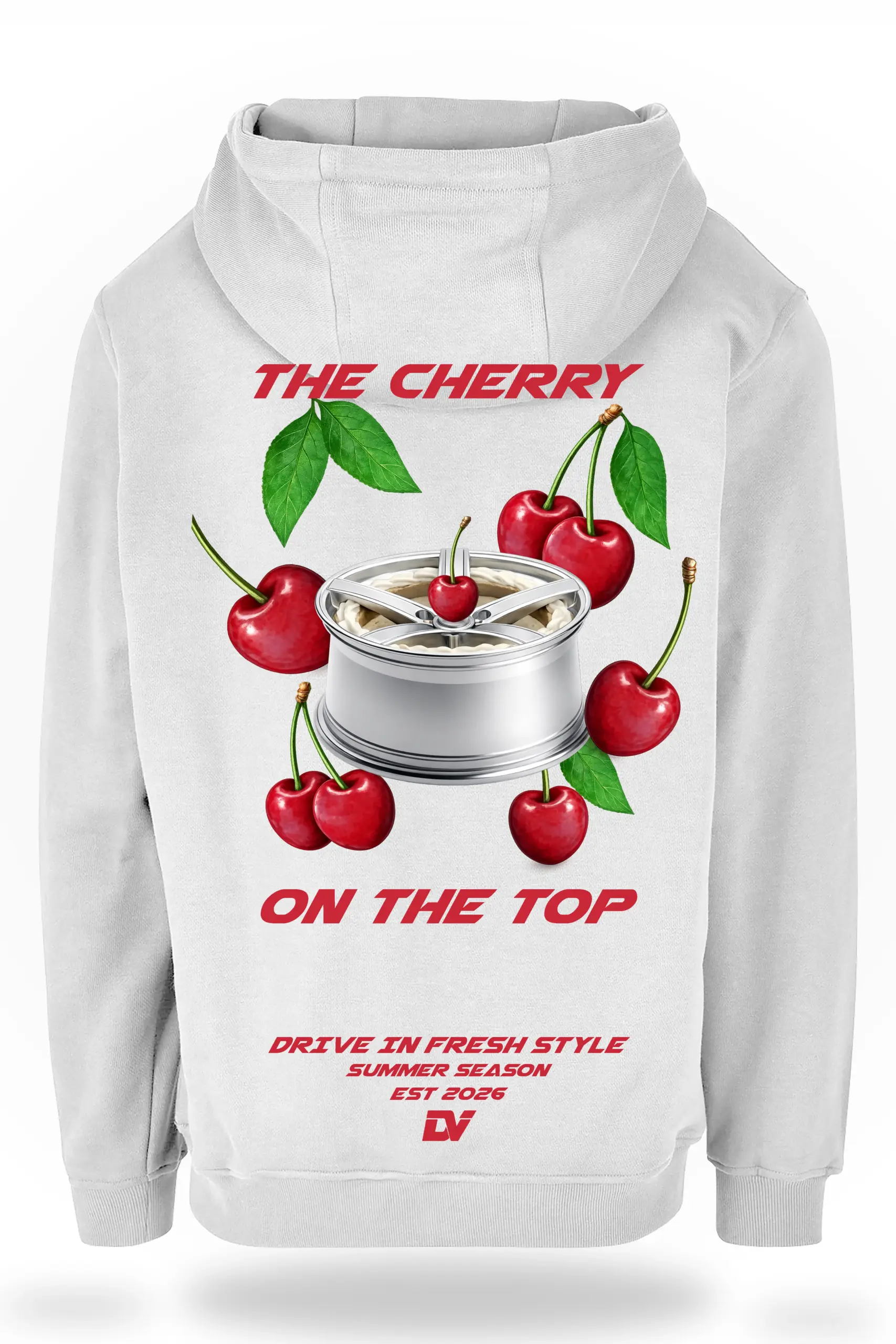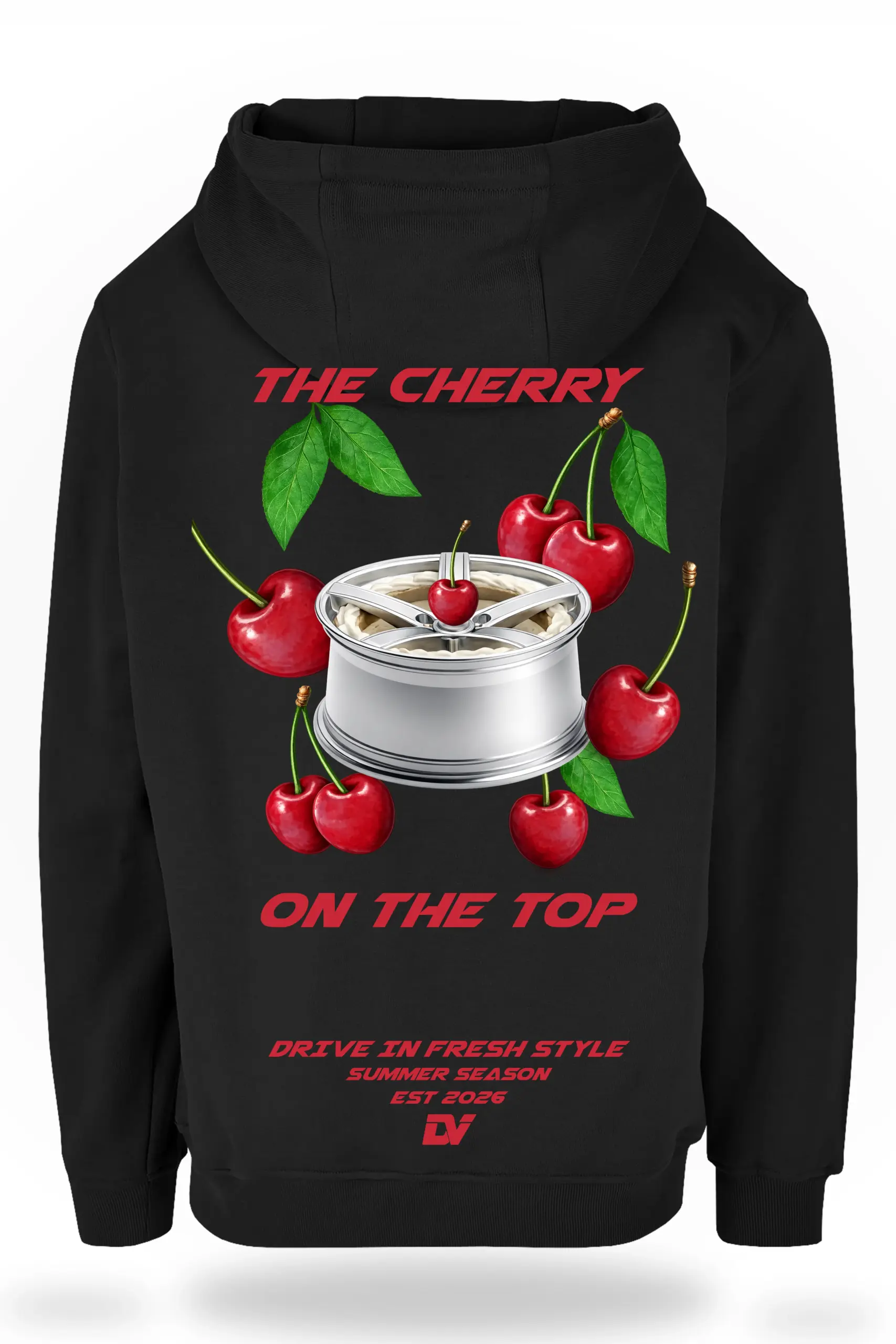 Frische, auffällige Farben treffen auf klare Automotive-Elemente. Die Felge im Zentrum bleibt der Anker, während die Kirschen das Ganze bewusst brechen. Nicht klassisch, nicht erwartbar.