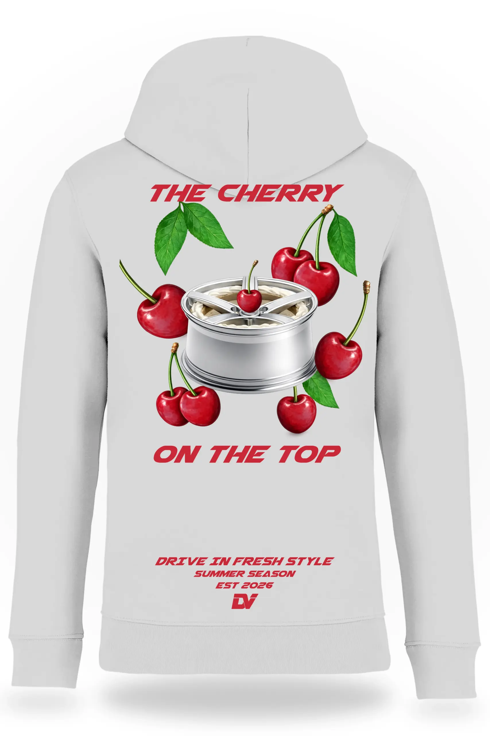 Frische, auffällige Farben treffen auf klare Automotive-Elemente. Die Felge im Zentrum bleibt der Anker, während die Kirschen das Ganze bewusst brechen. Nicht klassisch, nicht erwartbar.